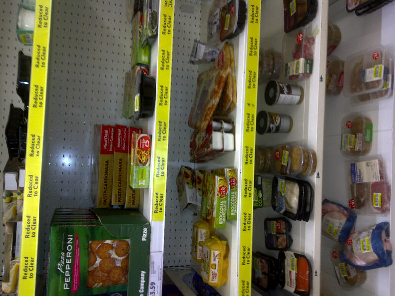 The usual suspects that end up in the reduced bin – chicken chunks, expensive meats, fish, fish sauce (always the last to go) pizzas, ham and pate from the deli, lasagna and ready meal curries – are items I rarely choose. There are items I regularly buy which never get represented in Reduced To Clear.