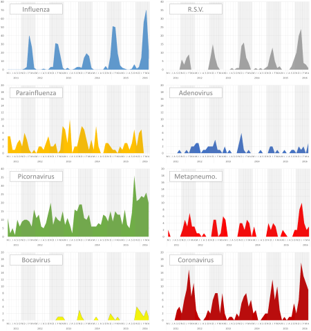 “Prevalence of respiratory viruses among adults, by season, age, respiratory tract region and type of medical unit in Paris, France, from 2011 to 2016”