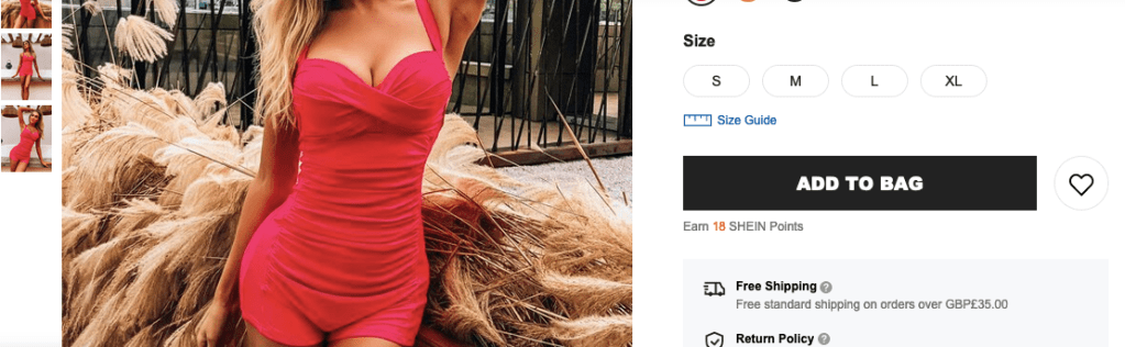I narrowed my searches to colours and descriptions I liked. There were either tankinis, high waisted bottoms, “boyleg” shorts or ruched, all-in-one styles, which would be flattering on me. I find a style I like, then I meet the next barrier: sizing.