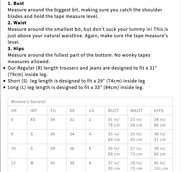 Tell me what S, M, L or XL means? There’s a size guide. That leaps into exact measurements for bust, waist and hips. Who knows these? Surely shoppers just want a 12, 14, 16 etc or European, widely used and well-recognised 38, 40, 42 etc?