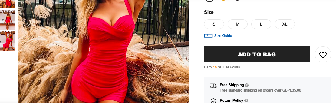 I narrowed my searches to colours and descriptions I liked. There were either tankinis, high waisted bottoms, “boyleg” shorts or ruched, all-in-one styles, which would be flattering on me. I find a style I like, then I meet the next barrier: sizing.