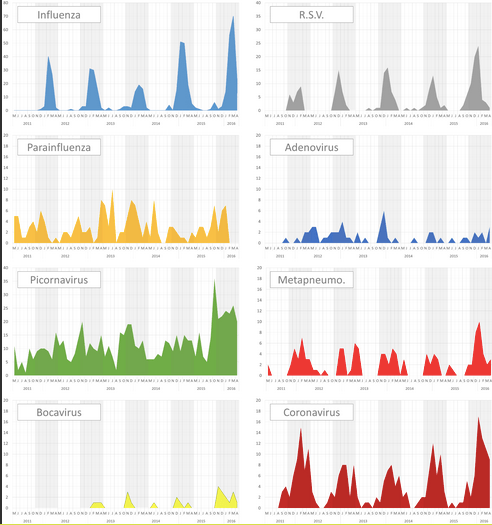 Prevalence of respiratory viruses among adults, by season, age, respiratory tract region and type of medical unit in Paris, France, from 2011 to 2016 –